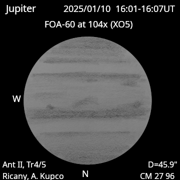 UO4): Velmi dobrý seeing. Viditelné detaily v pásech. Místy, kolem 00:00UT, i zřetelně Rudá skvrna. Pozorován průchod jednoho měsíce přes kotouč a dva stíny. Nádherné divadlo!